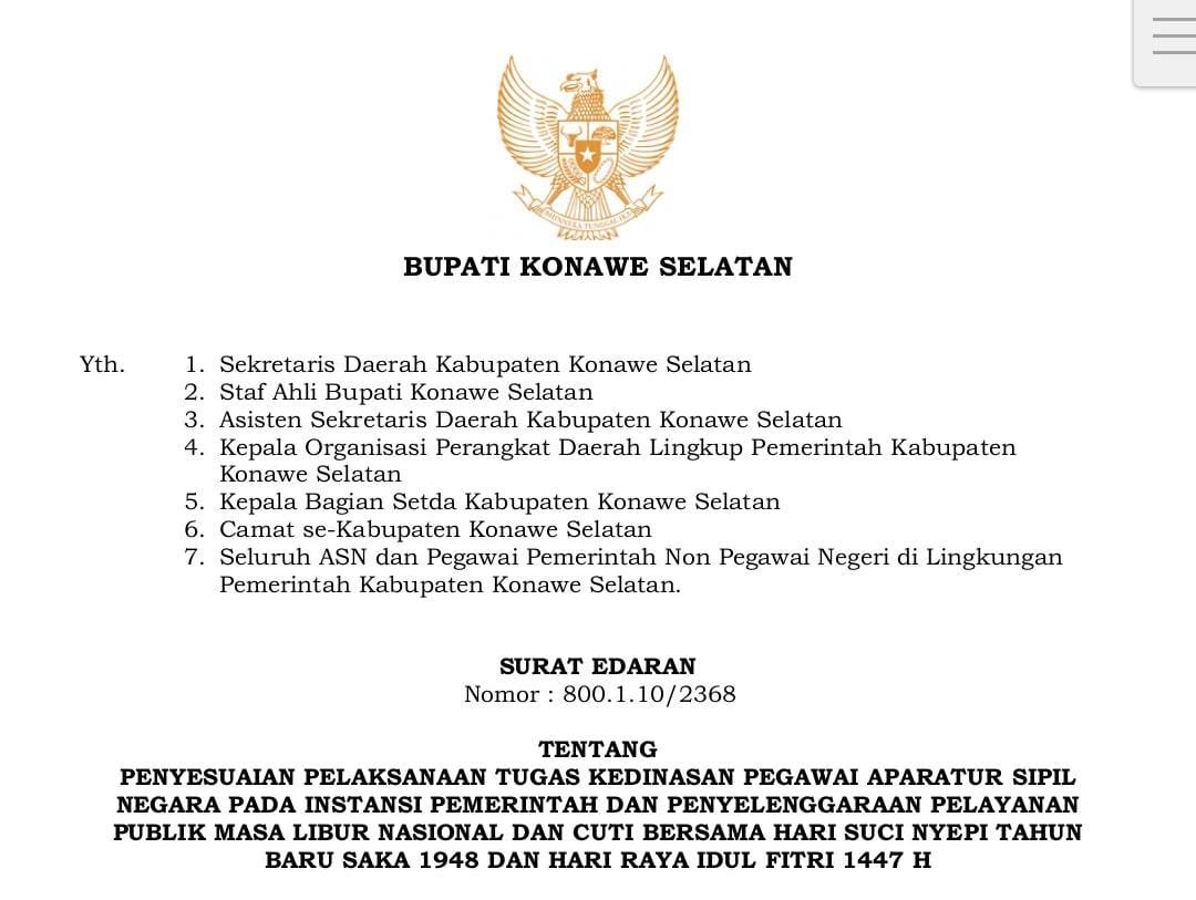 Kebijakan tersebut tertuang dalam Surat Edaran Bupati Konawe Selatan Nomor: 800.1.10/2368 yang ditandatangani oleh Bupati Irham Kalenggo pada 10 Maret 2026. Langkah ini diambil guna menjaga produktivitas kerja sekaligus memastikan kelancaran mobilitas masyarakat selama masa libur panjang.